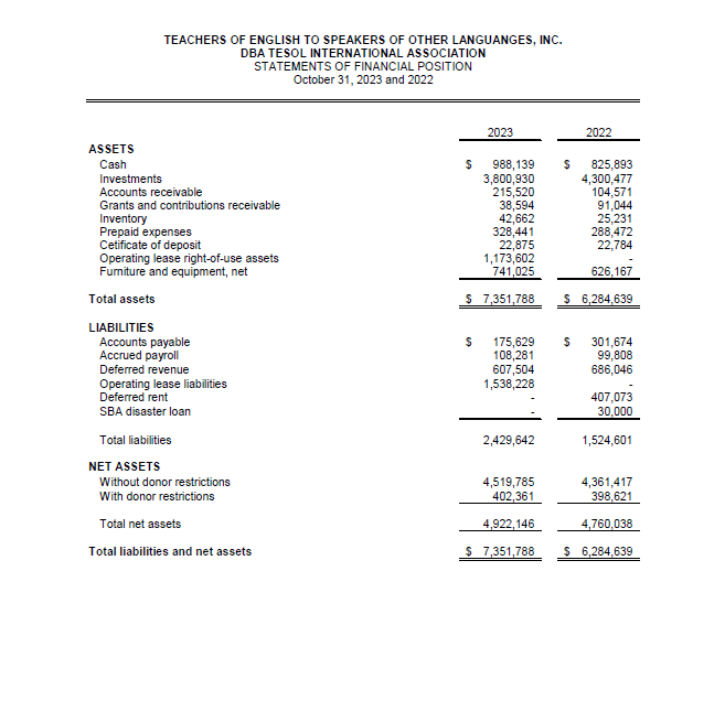 While we continue to rebuild from the Pandemic and the global economic downturn, TESOL did end the year with a positive change in net assets before investments. This was our second in-person convention and it was again smaller than a TESOL pre-pandemic convention. On a positive note, TESOL’s grants and partnerships continue to increase and our overall revenue sources continue to diversify.