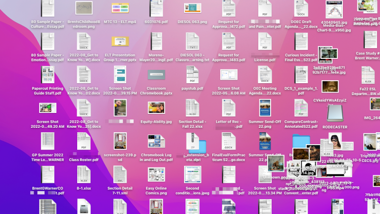 Yes, someday soon (very soon) I need to clean this up, but if I don’t have time before my next class, I can use a few quick tricks to virtually “toss the mess in the closet” before everybody else can see it. If you’re on a Windows machine, simply right-click on the desktop, then click “View,” then uncheck “Show Desktop Icons.” This will make everything clean and clear, then you can simply repeat the process and recheck “Show Desktop Icons” to bring them back. On a Mac, you can download a small app like Desktop Curtain and add it into your menu bar for quick on/off access, including programmable hotkeys to toggle it on or off at the flick of a wrist.