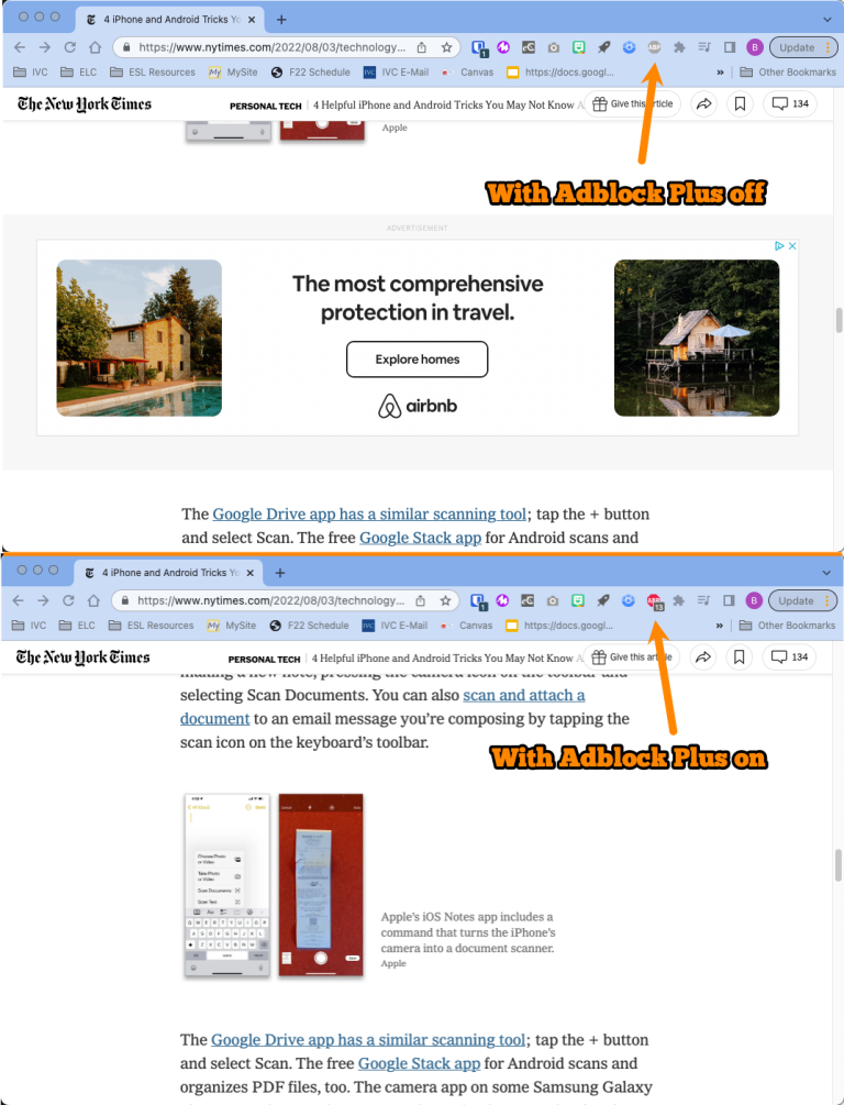 For years, Adblock Plus has been the go-to solution for people fed up with intrusive advertisements. Adblock Plus creates extensions for pretty much whatever browser you use, so whether you’re on Chrome, Firefox, Safari, or something else, they’ve got you covered. Adblock Plus does a great job of getting rid of the extra junk and keeping your class on track. Let’s take a quick look at the difference between the same page with Adblock Plus unactivated and activated: