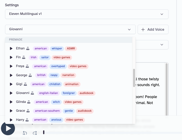 In the image above, we can see the voice option for Giovanni, who speaks English with an Italian accent. I used ChatGPT to create a quick and informal speech, and this is what it came out sounding like, processed through the Giovanni voice: