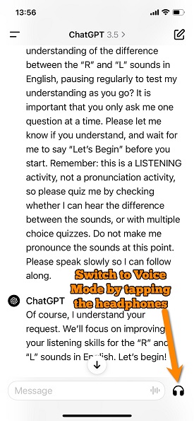 Once the prompt is in, students can tap on the headphones icon on their screen, which will switch ChatGPT from text mode to voice mode. From here, it’s a simple matter of listening along and trying to respond to the questions they are being asked.