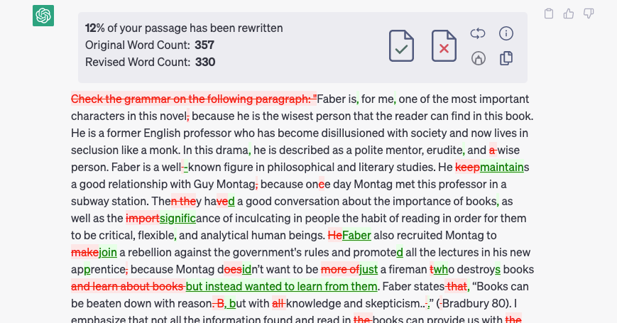 (Image comment: The red strikethroughs show where EditGPT suggests deletions, and green shows where it suggests adding or replacing information. Teachers can also use the percentage guide to help students determine whether they’re improving over the course of the semester)