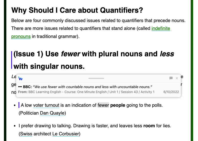 (Image comment: Here I tried to use WiseOne on GrammarMonster.com rather than a more advanced research-based site. Note that the pop-up window finds that the BBC Learning English page gives similar information, allowing a student to feel confident that they are on the right track.)