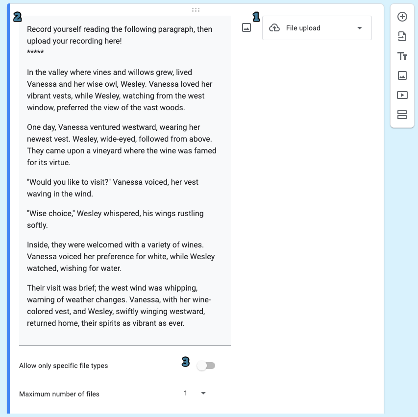 - Create your directions. Here I entered a short story where students can work on the difference between the “W” and “V” sounds, but you should customize to whatever pronunciation goals you have.
