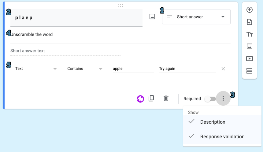- In the new Description field, put in your directions, such as “Unscramble the word”
