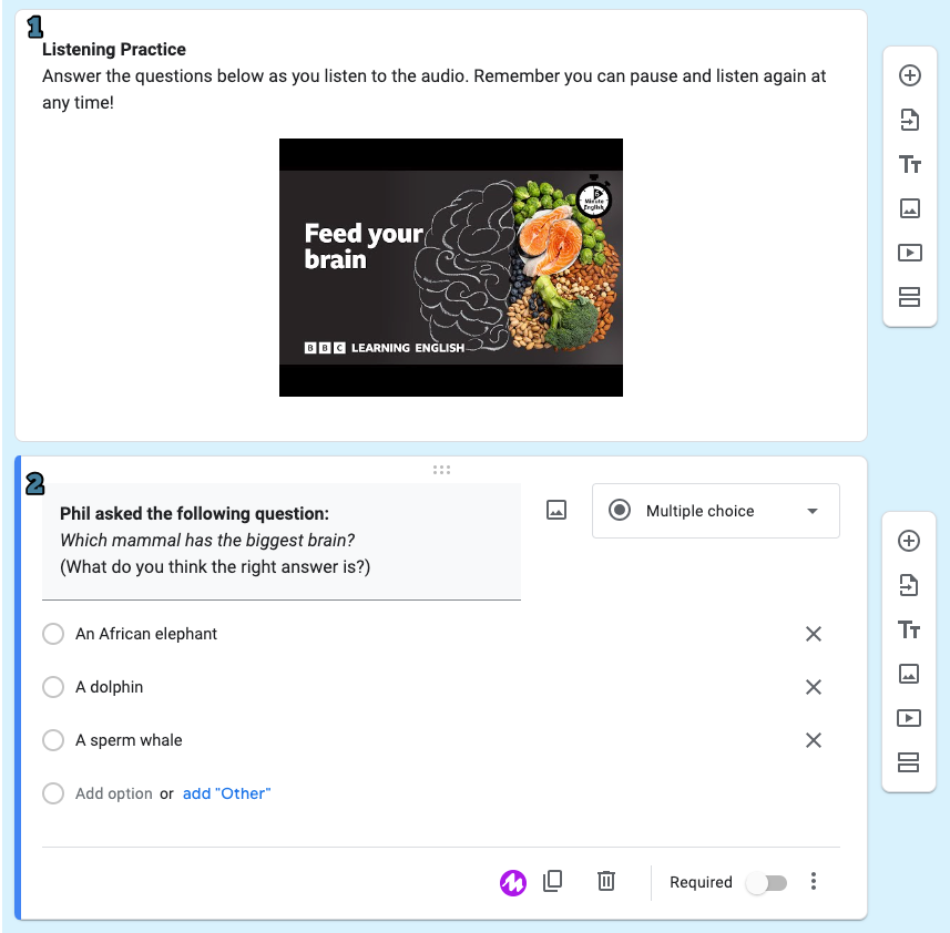 - Create a new question below by clicking on the “+” button and create questions based on the listening that are appropriate for your students’ level.
