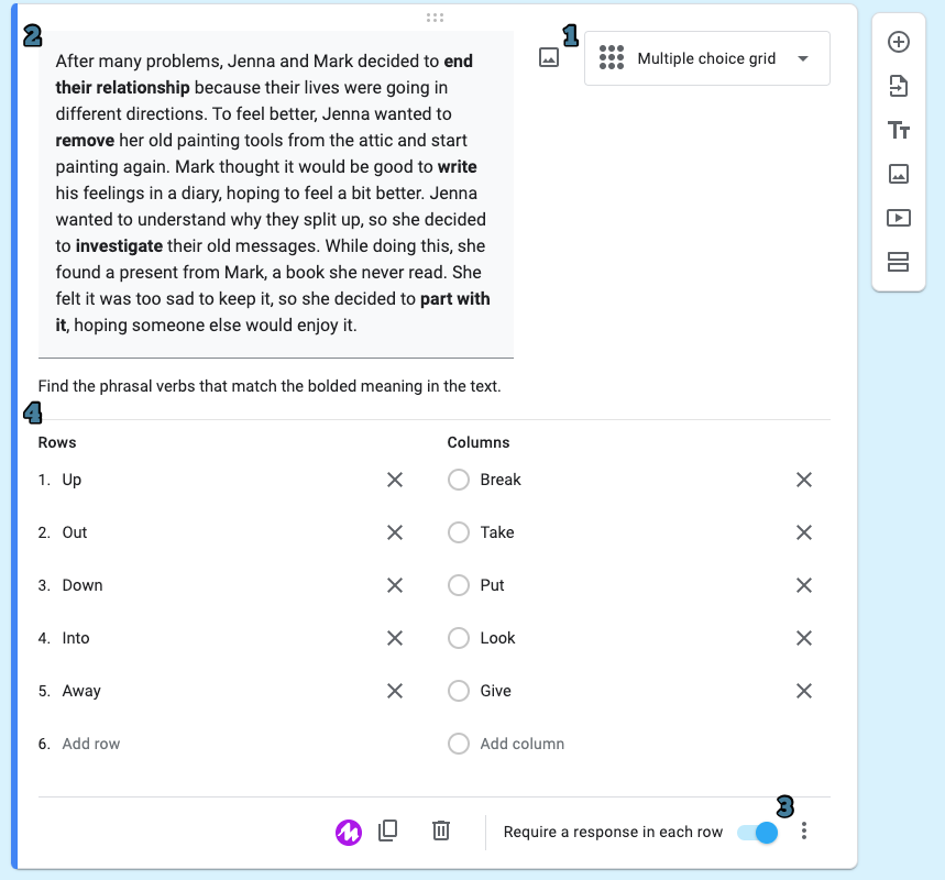 - Put the verbs in the “Columns” section and the prepositions in the “Rows” section. Note that this will look backwards to you in the setup, but it allows the form to shuffle the prepositions (option available when you click the “Three Dots”) while keeping the verbs in your preferred order to match the story. Of course, if you want to make things more difficult, you can shuffle the order of all answers manually.