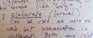 Because these vocabulary items are already in the student’s passive vocabulary, they will know the meaning, but they might not be familiar with the pronunciation, formality, context, or usage. For this second step, students research the word in a learner’s dictionary, making notes in their journal. I generally recommend Collins, but there are many good free online dictionaries.