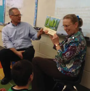 With picture books, make sure you hold the book so students can see the pictures as you’re reading. With longer books, you can project the page onto a screen in your classroom. Reading the text and then showing pictures doesn’t count. To be fair, this happens more often with inexperienced guest readers, such as a visiting dignitary or a parent volunteer. Teachers who do effective read-alouds have mastered how to read while holding the book so everybody sees the pages. This photo shows my husband and me as guest readers doing a Turkish-English bilingual read-aloud to a first grade class. It wasn’t perfect, but at least we were making sure everybody could see.