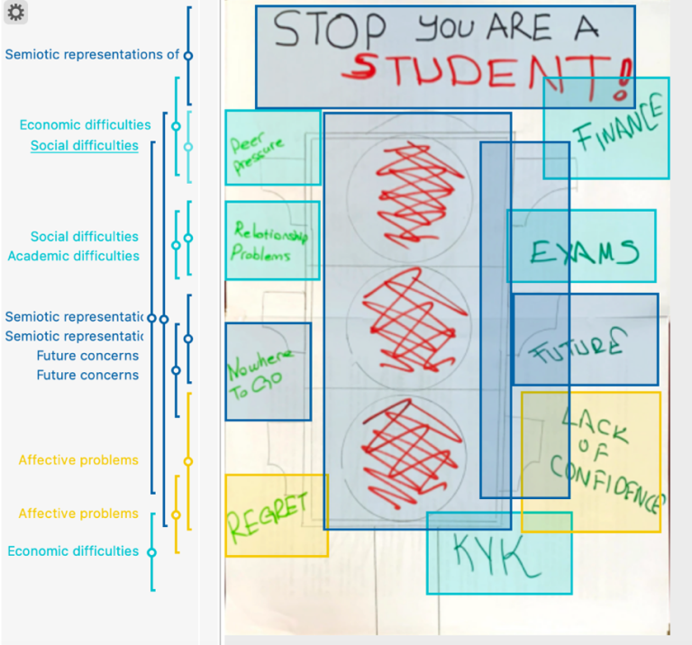 Teaching “lends itself naturally to data collection” (Burns, 2010, p. 54); almost everything from school documents to students’ work constitutes data. The QDA software helped me to manage the data pile, connect different data sources, and understand the multimodal opportunities afforded by action research. For example, the picture in Figure 1 is a screenshot from the QDA software interface that shows how I coded a group work activity product.