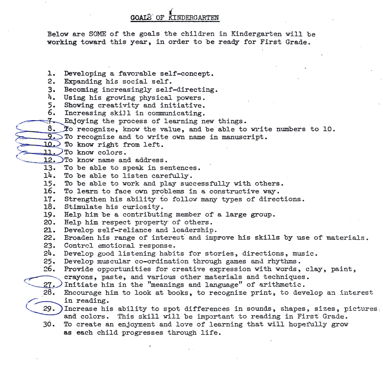 A final example of how high expectations can morph into hurried ones is this “goals of kindergarten” from the 1960s: