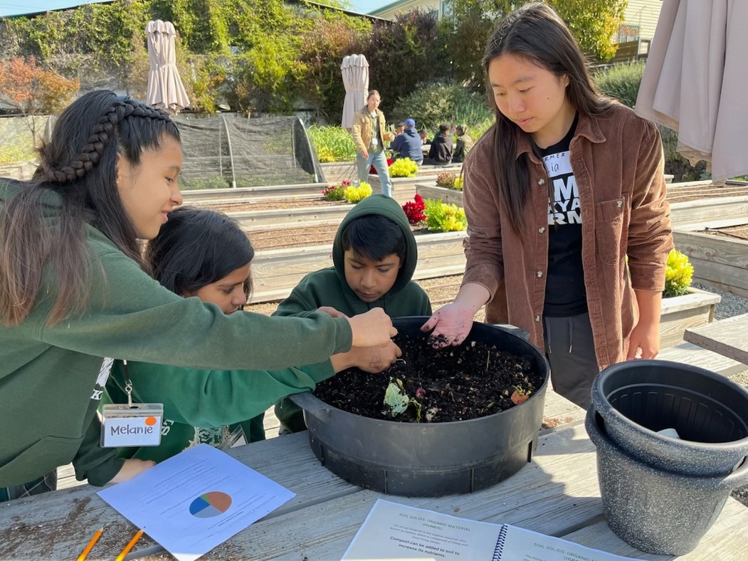 Lia explores the vermicompost bin with fifth grade students at Alma Backyard Farms.