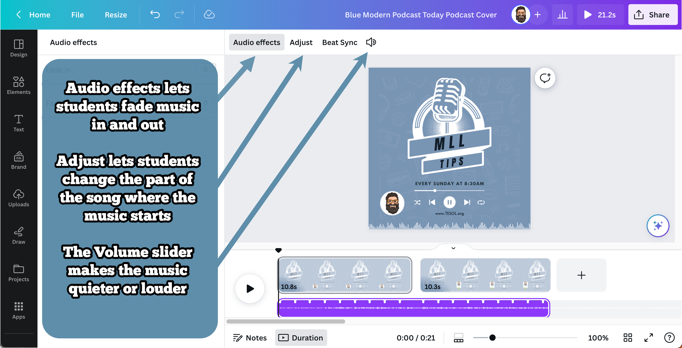 Today, we’re going to step things up a bit and use Canva to make podcasts in the classroom. Helping students build their speaking skills through podcasting has been a passion of mine for years, but I’ve always struggled with finding a good platform to record on. That struggle is now over. Using Canva to record and edit podcasts is the easiest way to get students talking, and you can work on it in stages, as I lay out below.
