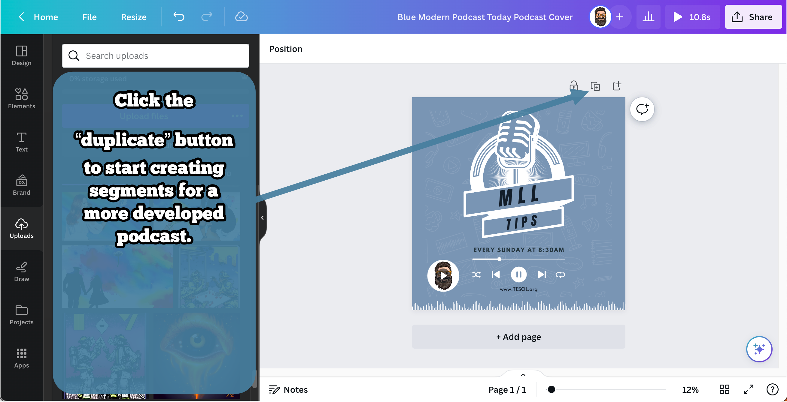 - Creating Segments: For a detailed and segmented podcast, students can create multiple sections that will automatically combine to form a clear narrative. For each segment, students should click the “duplicate” button, which preserves the visual theme across sections. Students will find their recording connected to their avatar or account icon. Every time they duplicate, they should delete the recording on the new page (duplicate brings everything across), then begin the recording process again as above.