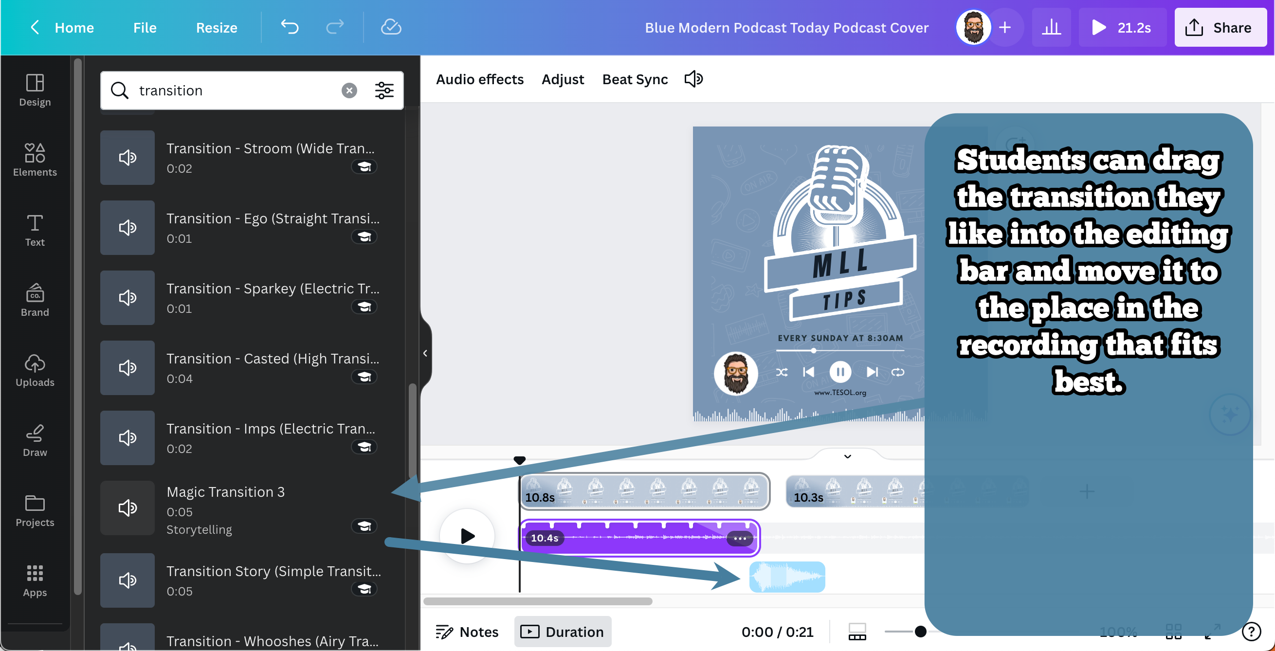 - Integrating Transitions: For a real professional feeling, guide students to incorporate transitions for a smooth flow between different segments, adding a professional touch to their podcast. This is done in the same way as above: click “Apps” then “Audio”, then search for “Transitions”. Students can drag the transitions down into the editing bar at the bottom and position it where they think is most appropriate.