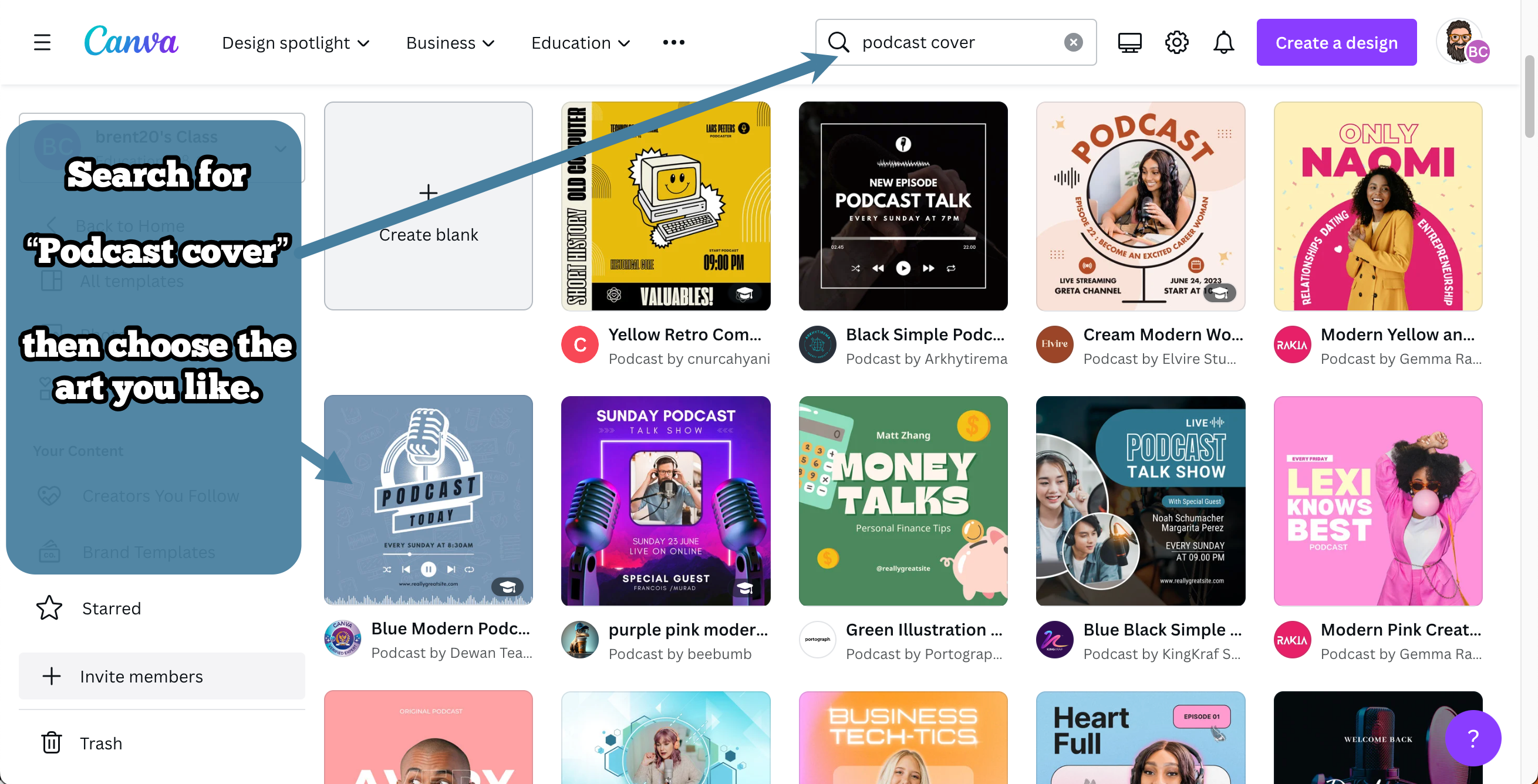 - Choosing a Template: Direct your students to select an appropriate template. A good starting point is searching for “Podcast Covers”; this category offers templates with a professional base for their project.