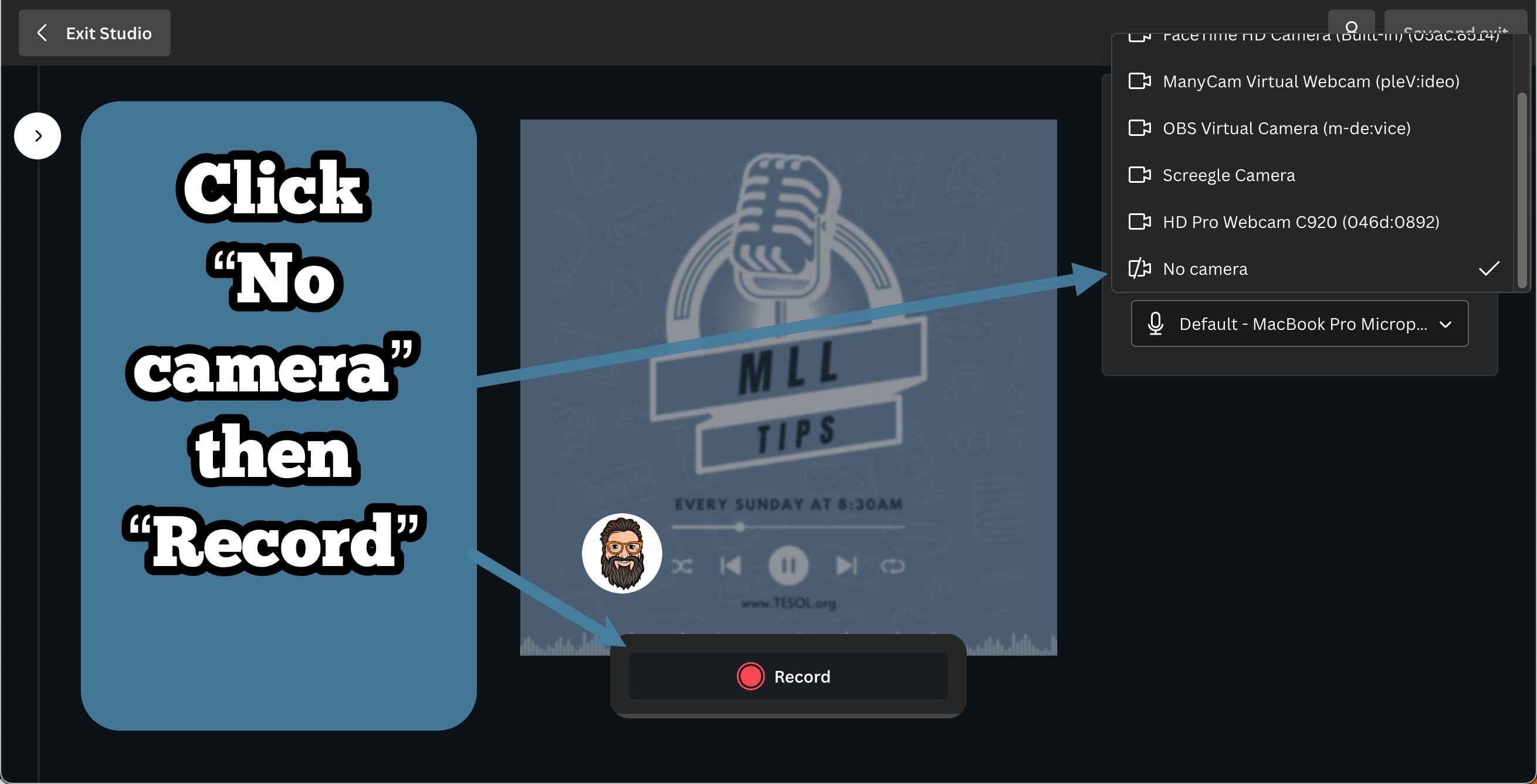 - Setting Up the Recording: The default setting is video recording, but this can be easily switched to audio-only by going to the “Camera” box and selecting the “No Camera” option.