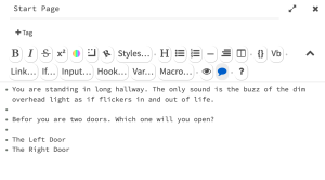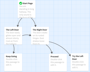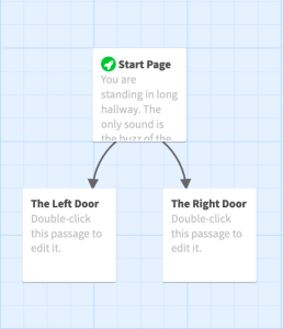 The story is working and ready for play testing. As seen in the image above, “The Left Door” and “The Right Door” are now clickable links that will take the player to the next page of the story.