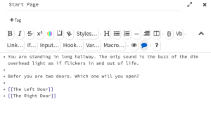 Twine features a basic word editor and a few extra features for people comfortable with code and scripting languages. Users can write their text and then provide the player a choice at which point the story will branch. Creating the branches is as easy as placing brackets around text. In the example above, the players will choose between entering the left or right door.