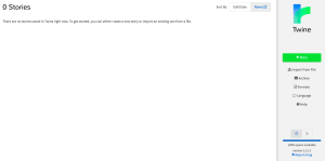 Twine begins with a landing page where creators can manage files and sort through the stories they have created. If this is your first story, just click on the green “+Story” to get started. After clicking on “+Story,” you are presented with Twine’s workspace.
