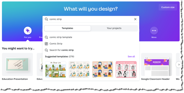 When you log in and type “Comic Strip” into the search bar, Canva will provide users with a large selection of suggested templates (276 at the time of publication) that you can use to start your students making their own comics.