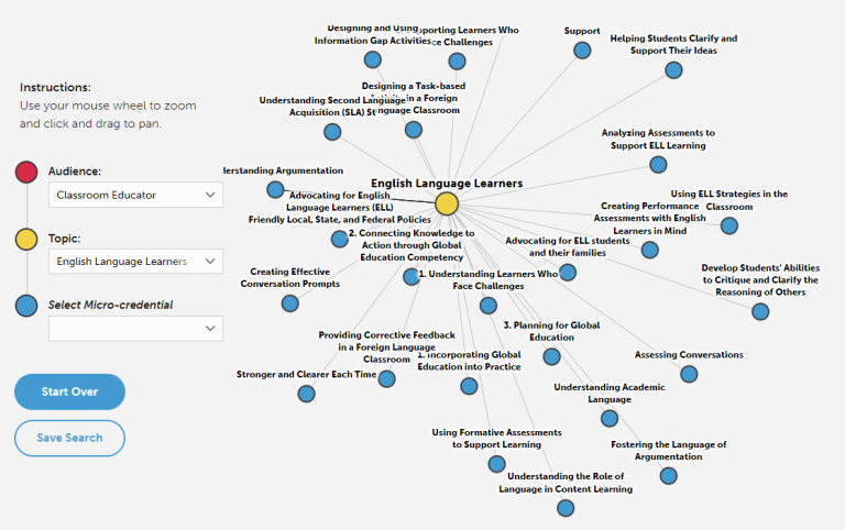The micro-credential courses they share are reviewed for quality and research-backing, and they are linked directly from the Digital Promise platform’s explorer platform. The concept they base their platform on is called “stacking”—adding credential to credential in a linked series to arrive at a new level of mastery in a particular area of education. Their explorer tool can also be filtered as a web of interconnected nodes, revealing many options based on the user’s role and topic of interest, as seen below.
