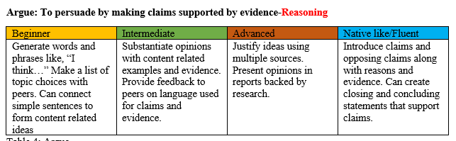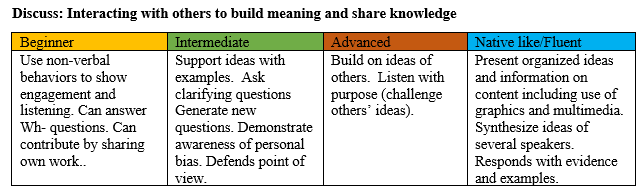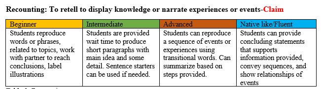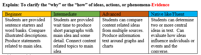 At the end of any CER activity, students should have the opportunity to interact with their class to share their knowledge and to build meaning. Here is what the teacher should understand in regards to abilities for each language proficiency level: