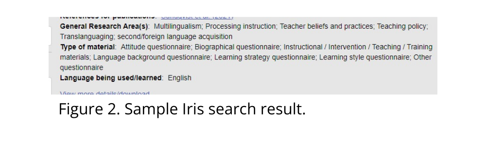 Iris: A Free Public Research Resource is a database of research tools for languages and language learning. Search by entering any text you wish or use filters to narrow your search. Filters include the type of material (such as assessment, coding, example interview guide, interactive task, role play), the language being used or learned, and participant type, among others. These research tools are used in studies of language development, of how languages are used and learned, and of the effectiveness of teaching interventions and strategies. For instance, entering the search term translanguaging produced five articles. Figure 2 provides an example of the types of materials (i.e., the research tools) available through one research article.