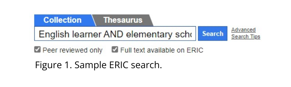 Education Resources Information Center (ERIC) is a database of published research in education. Search by entering any text you wish or use filters to narrow your search. Filters include topics, age groups of learners, language of publication, country, and many others. We suggest first selecting “peer reviewed only” and “full text available on ERIC” (if you are not affiliated with a university library). Such a search on November 7 with keywords English learner AND elementary school, as shown in Figure 1, yielded 365 articles published since 2022 that are both peer-reviewed and publicly available on ERIC.